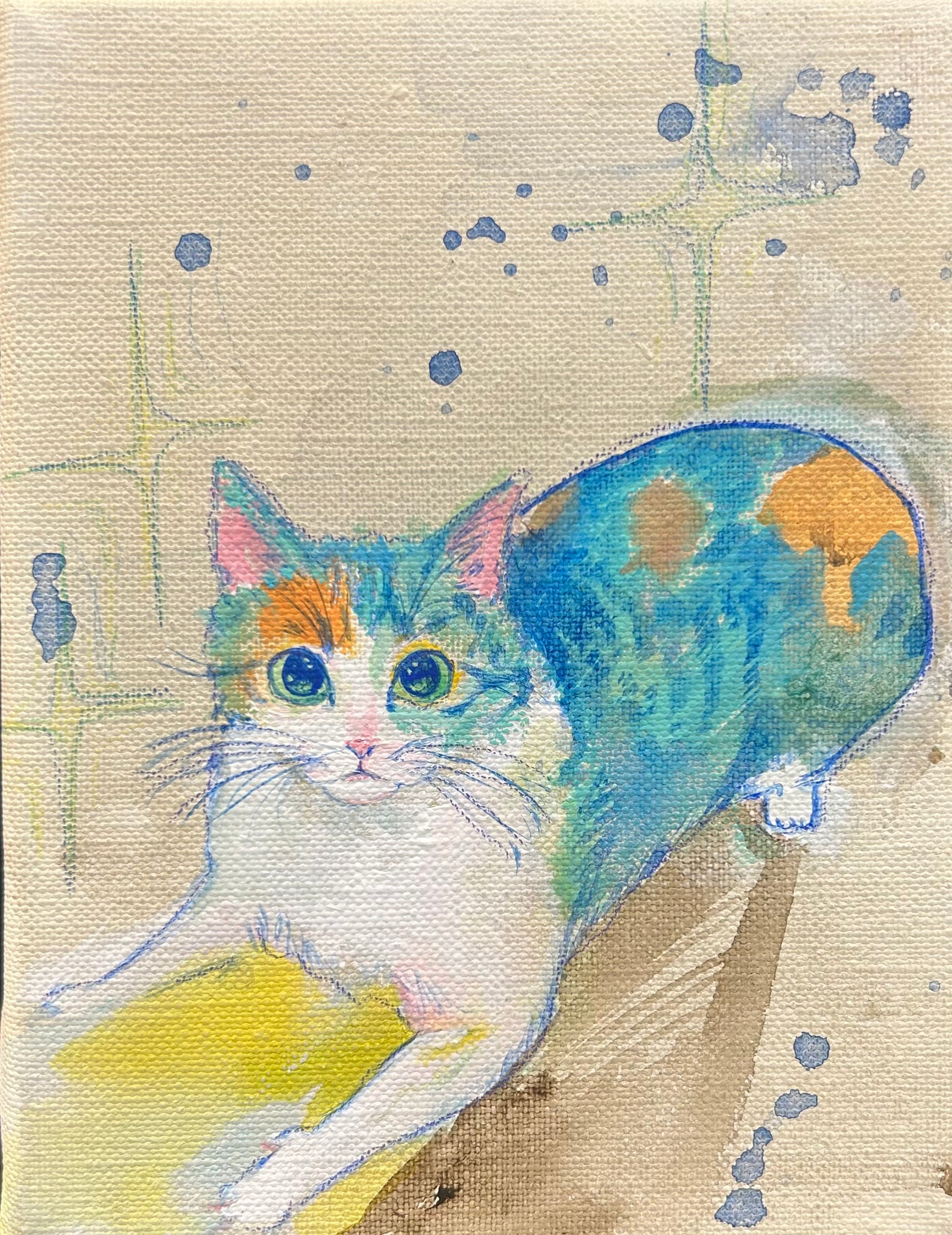 素材→キャンバスにアクリル絵の具、色鉛筆